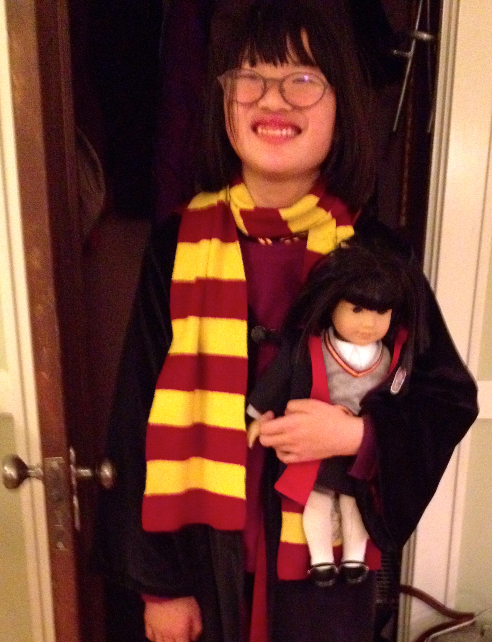 I think I re-gifted the baby doll Julia’s third or fourth Christmas home.  She didn’t beat it up but she didn’t play with it either.  But last Family Day, the combination of a doll that looked like her — American Girl Doll Asian-version Ivy, a “best friend” doll — and the Gryffindor uniform and robes that I made for Ivy made for pretty good insurance that she would look a bit favorably on the doll.
