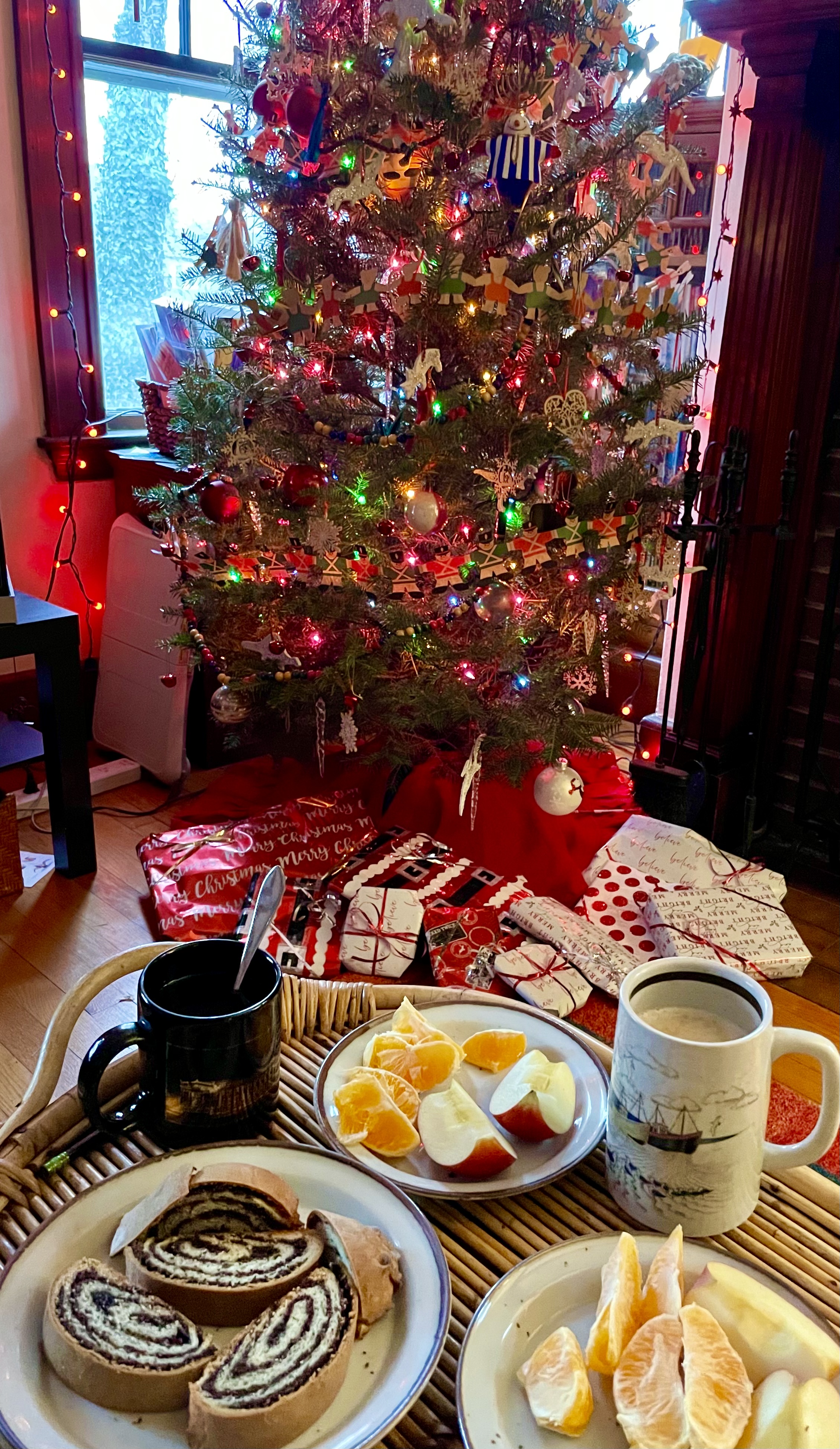 After truly enjoying the late service at FUUSN—singing with the choir and reading two beautiful pieces for the assembled crowd. And watching the darkened church come alive with the small candles that were lit one at a time from the front of the chancery to the back. After that, we went home and to bed, waking late, leisurely opening the gifts under the tree for Julia. We expected to return to New Hampshire to spend the day with Justin’s family, still sans Justin and Cheshire, but one of their number didn’t feel well and the roads were beginning to get icy. In crazy addition, Julia took a very unusual midday nap and I had a tickle in my throat. Neither led to anything more than what they were but I did not know that at the time. Perhaps none of these pointed to extreme risk and I should have just gone up for a Christmas feast for body and spirit, but . . . . well, we didn’t go. Julia was disappointed as she had worked on a craft gift. I had not planned any Christmas dinner. The day loomed very long.