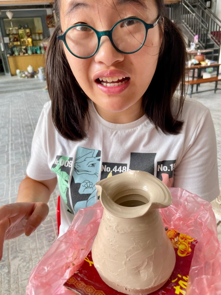 A suburb outside of the main city where the business is making clay things. Julia came from a province known for its clay making. Today, we spent the morning in that suburb, making something out of clay on a hand turned wheel. Julia needed a lot of help to calm herself down enough to patiently have a conversation with the clay. She has lost that patience to make things and this is a big loss. I sat with her today for hours and we turned the wheel together and made a little vase. It began as a lump of clay, we turned it into a bowl that collapsed as the sides became to wide. Then we pulled all the clay together and started again. I sat with her the entire time. I think if I left her to play and make by herself, she would have given up. And I talked a lot about having a conversation with the clay, to listen to it, to talk to it with her fingers. My heart breaks that she has lost the confidence and the patience to create on her own.