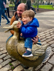 And now, for slight diversion, Wilbur and Dad discovering the Mama Duck of the duck family from Robert McCloskey’s Make Way for Ducklings (sculpture by Nancy Schön) in the Boston Public Garden.