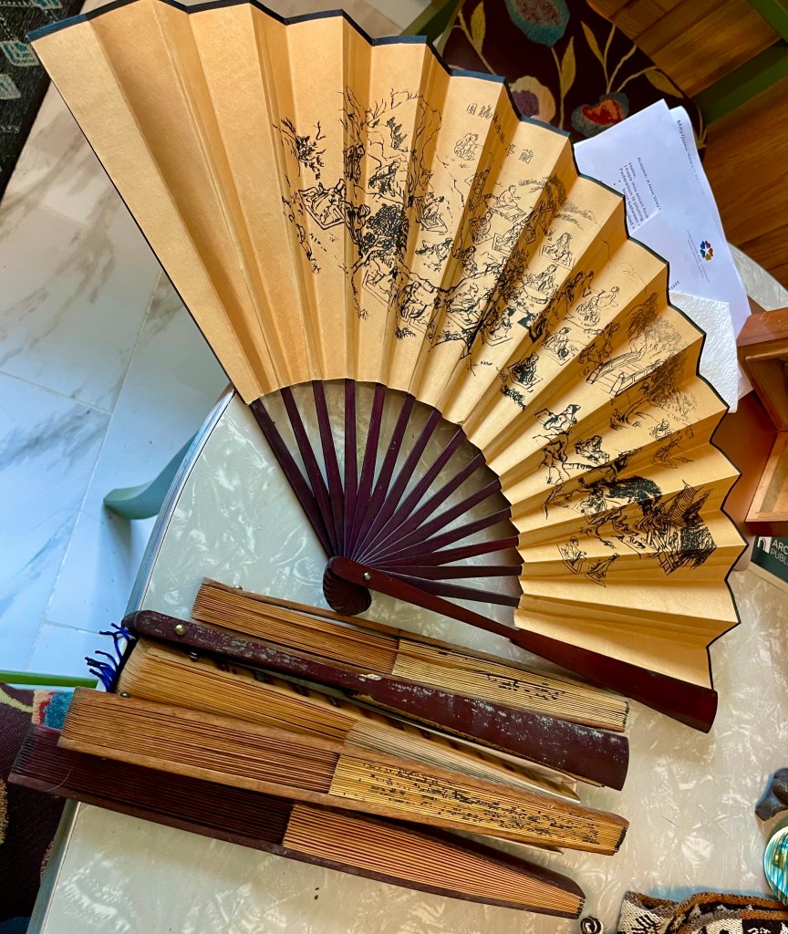 An old blue wine bottle that sat on a window sill in Indianapolis for a bit of color among the green plants, an old green bottle buried in my Madison garden, a green and metal vaporizer at least 70 years old that nursed David and then my girls through childhood colds, Chinese fans brought back from China and hung up or used for costumes, paperweights gifted to us, a tiny memory box with an old picture of Danny Kaye and one birthday candle, a small clock with a glued-on plaque commemorating David’s move from Deputy Clerk of Indiana to Clerk of the Wisconsin Supreme Court, Vietnamese cymbals and a gong, plastic glasses in good shape, an apple peeler, a thick woven Bolivian sash and a tiny Bolivian whistle, incense burners and many pieces of pottery made by Julia.