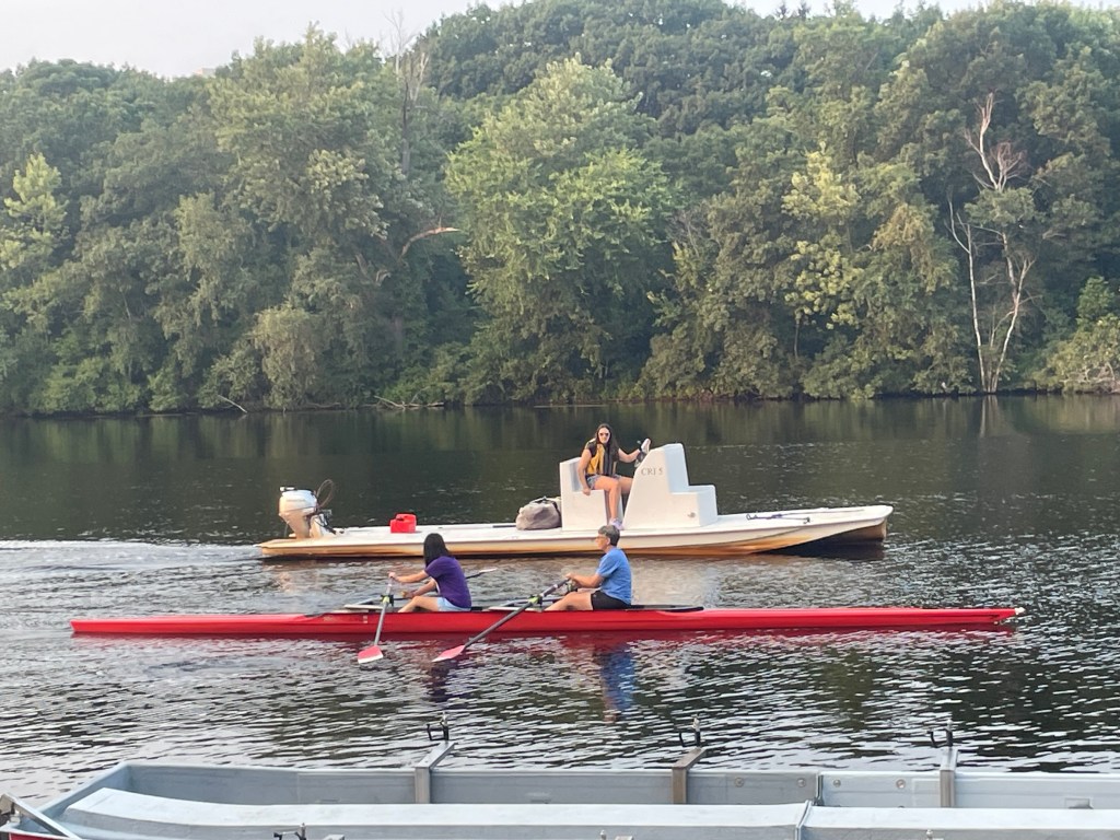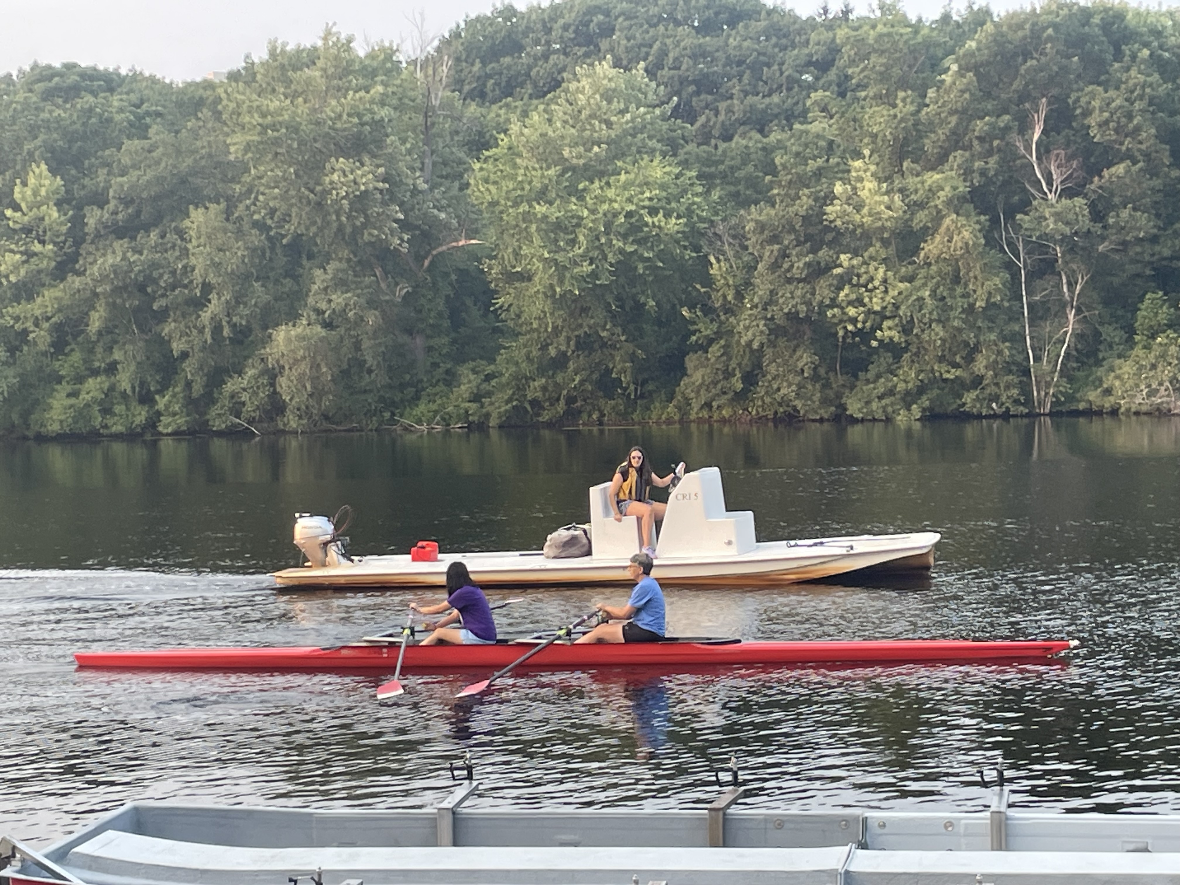 Julia rowing in a double with her coach, Lucy, in the chase boat.