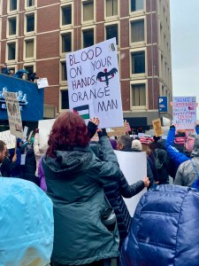 We shuffled forward, slowly down the streets, pushed and separated from our friends, losing parts of our group and being completely surprised that we found someone again in another block or two. By the time we were close to City Hall Plaza, there were announcements that the plaza was full and the speakers could be heard from other streets. I don’t think we were anywhere near the end of the march.