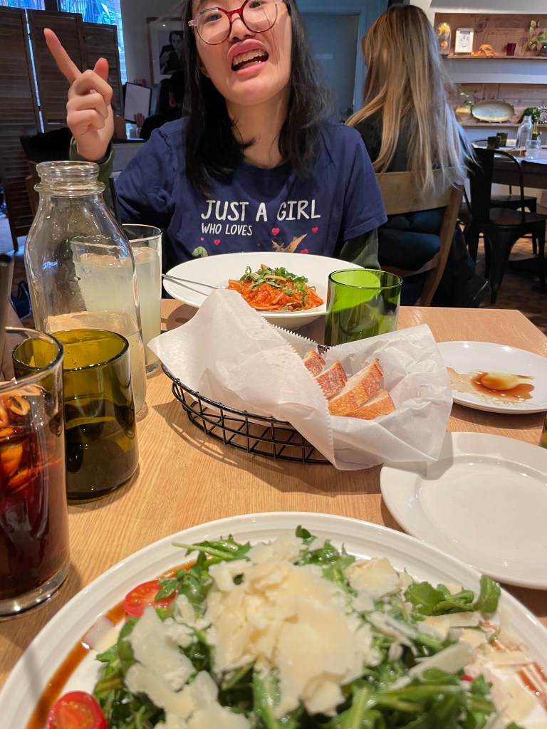 It also began raining—well, it had been lightly sprinkling for awhile—in earnest. The crowd’s chanting was noisy—someone using a cowbell very effectively was really bothering Julia. She said that she had enough and as it happened we were right in front of a T stop. It was the perfect time to stop walking, take the T to Newbury Street and finding a place for lunch.