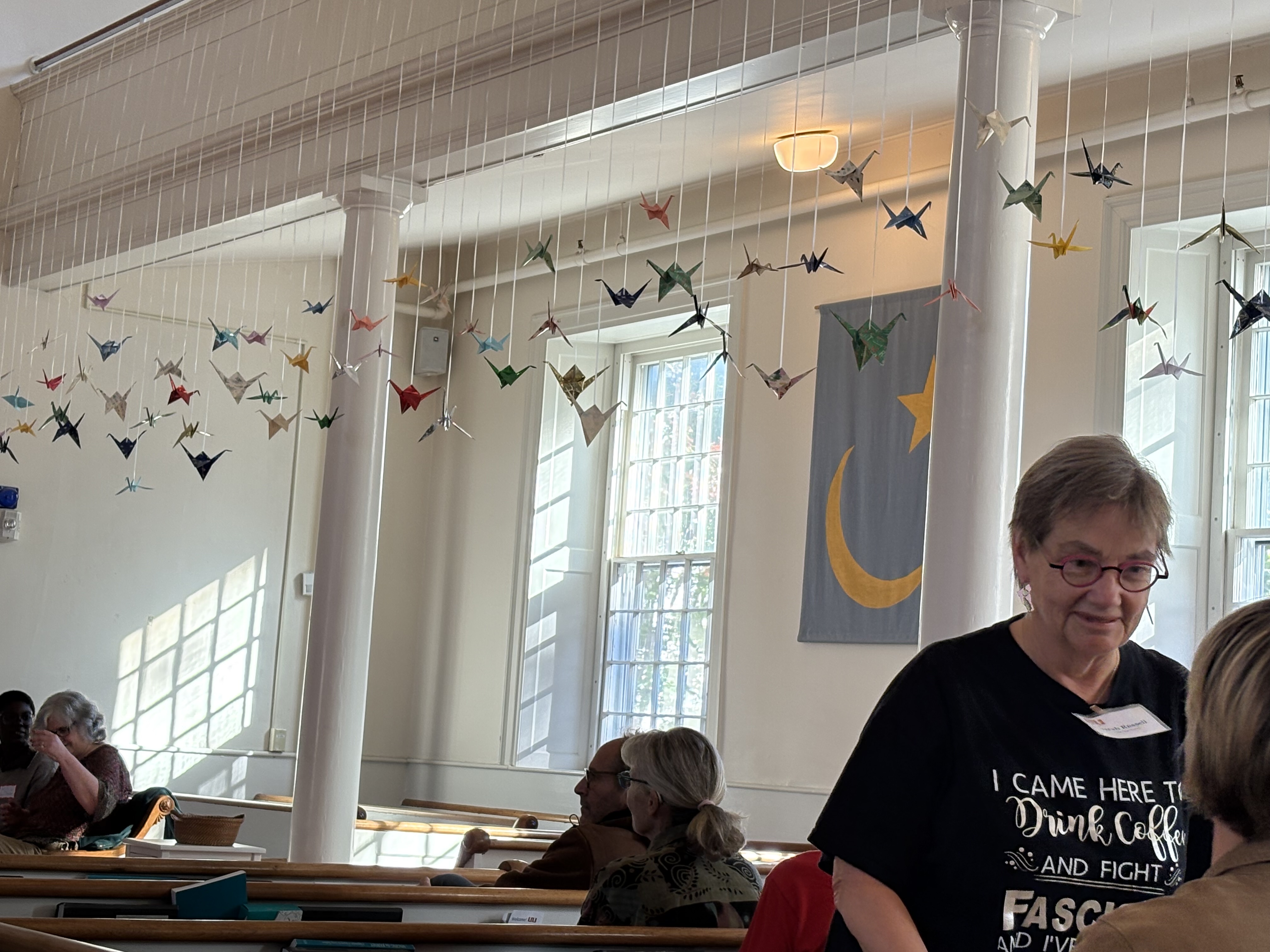 Sunday morning, we visited the UU church in Burlington. This is not at all a usual start of a vacation Sunday, but I felt a need for community and peace. And the iconic New England church building sitting as it does at the top of Church Street beckoned.