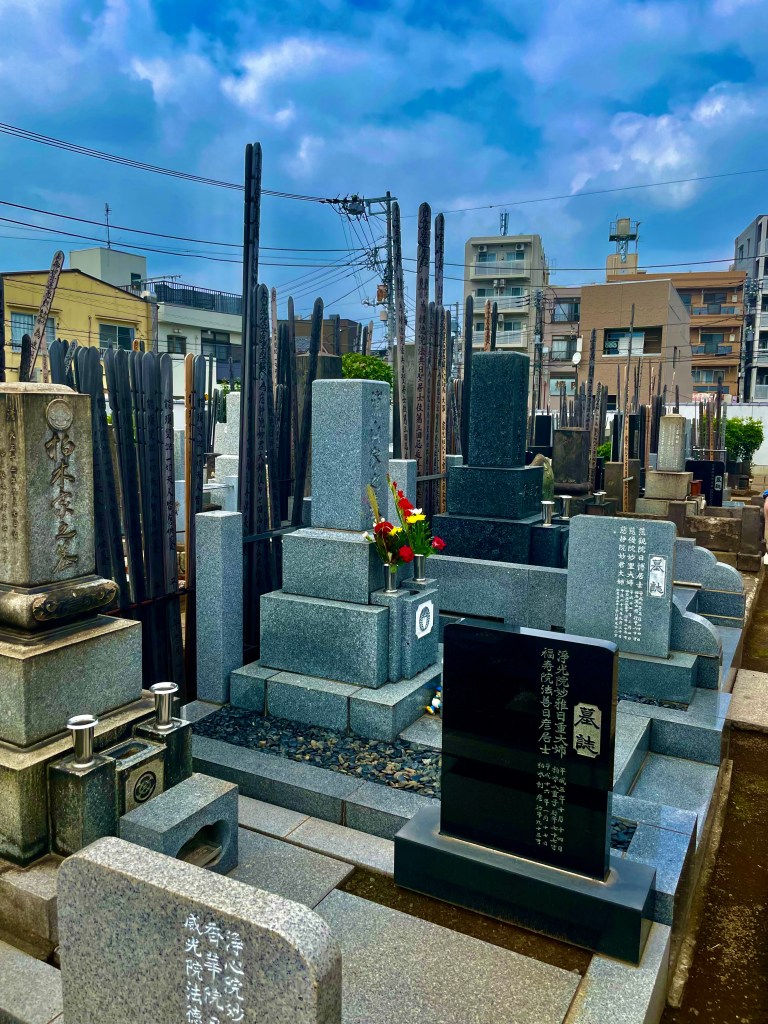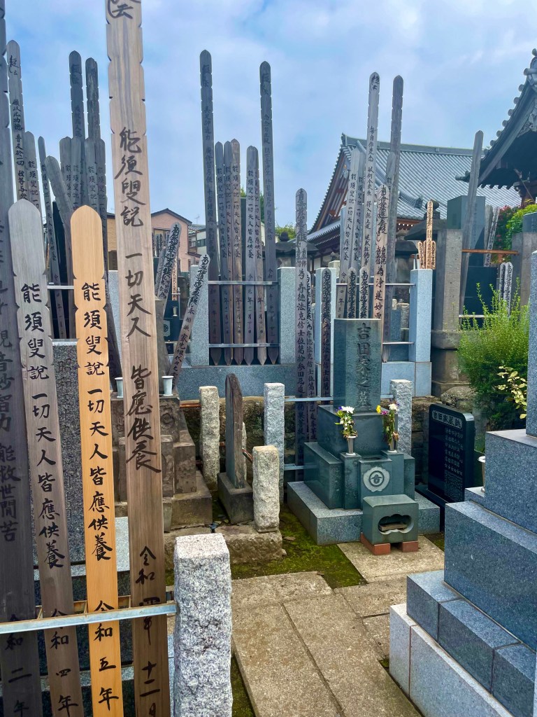 This small cemetery, tucked into a corner of Yanaka was surrounded by a wall with an open gate.Some of the graves were very old, some from earlier this year. A few had an announcement tied onto the stone which said that it was suspected that this grave had been abandoned and the upkeep was unpaid. If someone did not come forward to claim the space, the remains buried would be dug up and respectfully burned, and the space made available to another family. I wonder if this was just the reality of a city where all real estate is valuable.