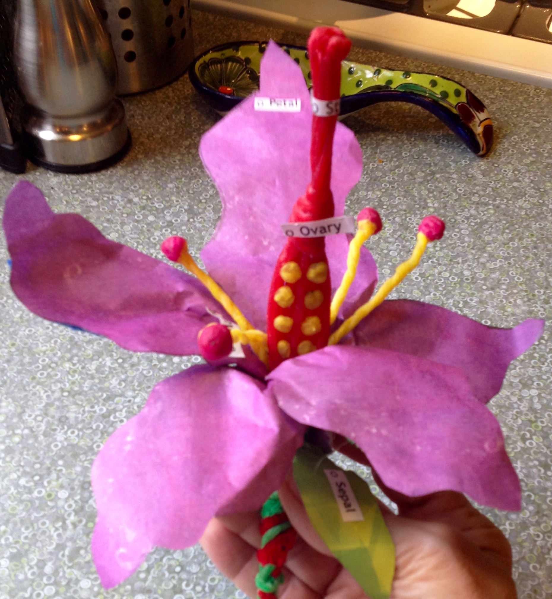 This is a picture of Julia’s last science assignment done last weekend — four days before school ended. She was reluctant to begin it but once started, she fully engaged and worked longer on it than was necessary. Science has not been a favorite subject this year mostly due to the abstract ideas presented and Julia’s preference for the concrete. However, since late winter, the focus has been on the tangible earth. Julia drew and painted a lovely paramecia, she understood plant parts and what plants need for a thriving life by growing peas. And now, she demonstrated her understand of a flower, its parts and how it works making this model. Wiki sticks, pipe cleaners, origami paper and lots of glue were her tools. If she was in an environment where learning was this hands on . . . she needs to be in such an environment all the time.